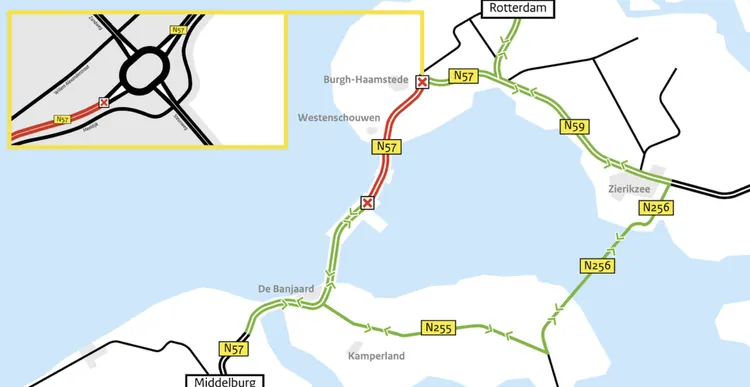 Rijkswaterstaat sluit in het weekend van 16-19 april 2021 de 2 nieuwe rotondes bij Burgh-Haamstede aan op de autoweg N57. Daarom is de N57 tussen de rotonde Steursweg (Burgh-Haamstede) en Neeltje Jans (Oosterscheldekering) in beide richtingen afgesloten.