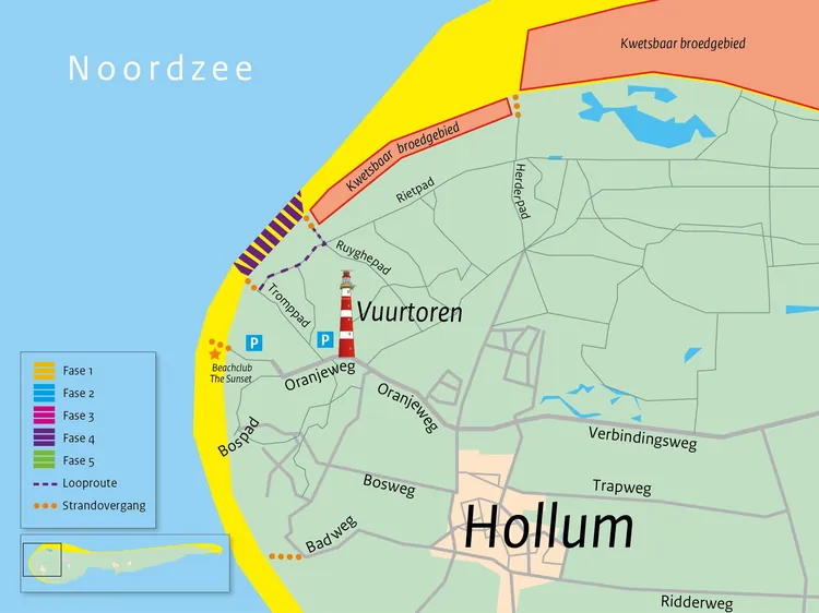 Tijdens de suppletie van het strand van Ameland West zijn er verschillende fases gedefinieerd. Tijdens sommige fasen is het strand volledig afgesloten. Bij een "update" bericht in de app zal er worden aangegeven in welke fase de werkzaamheden zich bevinden. Bijgevoegd een kaartje met het totaal overzicht van de verschillende faseringen. Daaronder de fase waar op dit moment werkzaamheden worden verricht.
