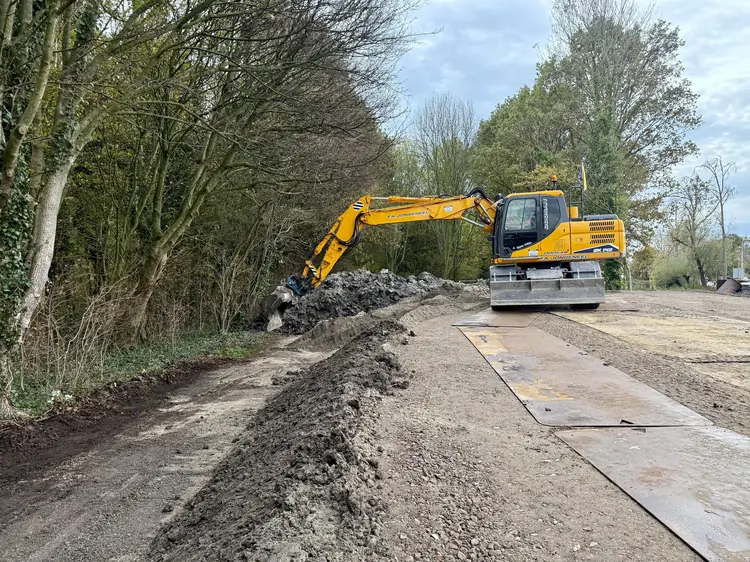 In mei hebben we de fietsbrug over de Trekvliet geplaatst, als onderdeel van het tijdelijke fietspad dat we aanleggen aan de noordzijde van de N206. In de komende weken gaan we aan beide kanten de aansluiting op de fietsbrug maken, aan de kant van de Rooseveltstraat en de kant van de Corbuloflat. De werkzaamheden bestaan onder meer uit het verwijderen van bestaande verharding, het aanbrengen van grond en ophoogmateriaal en het aanbrengen van nieuwe verharding. Om de aansluiting op de fietsbrug te maken, bouwen we aan weerszijden een steigerconstructie.