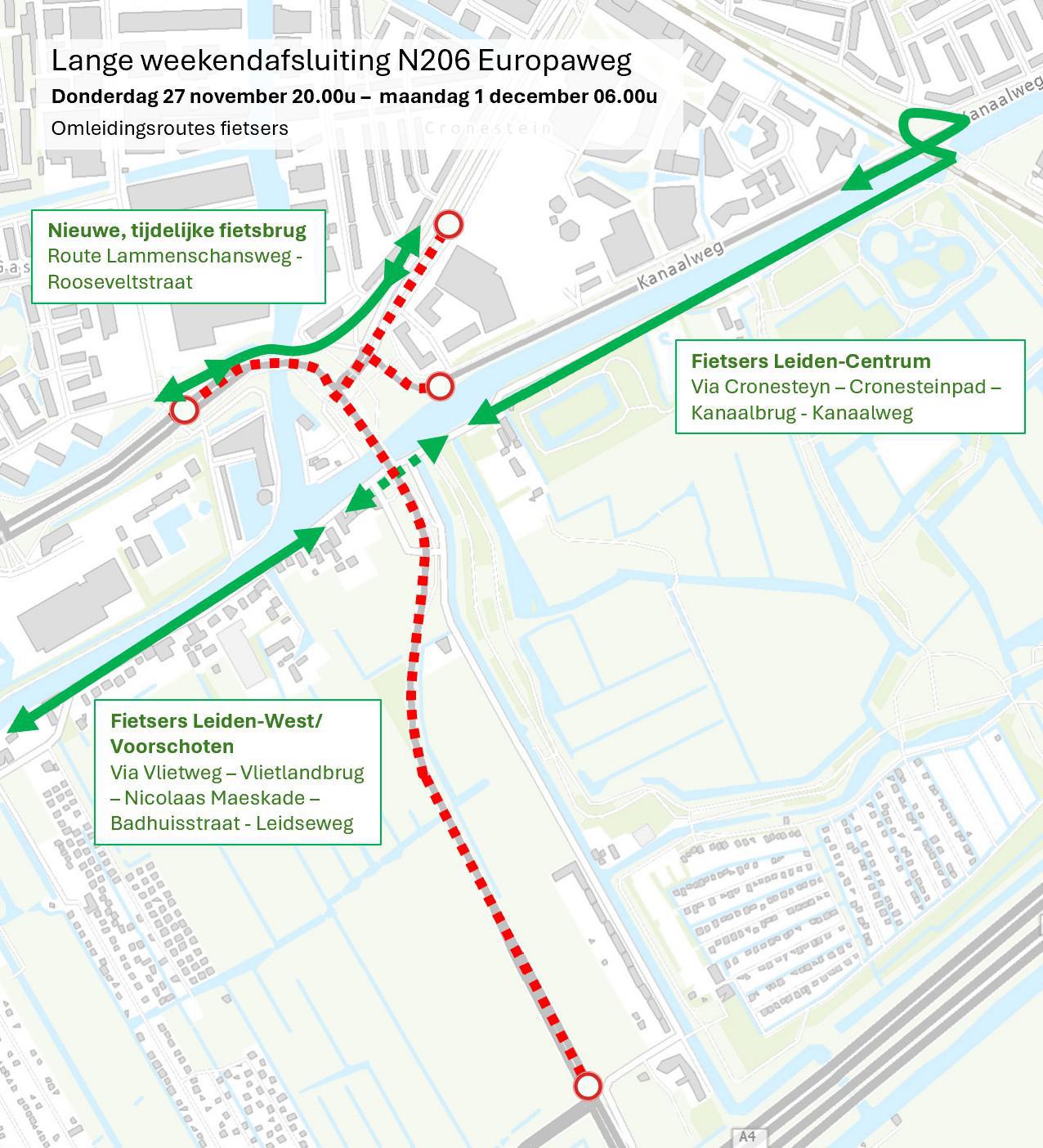 In de periode november 2025 tot en met februari 2026 voeren we op de N206 Europaweg en het Lammenschansplein werkzaamheden uit die op sommige momenten invloed hebben op de fietsroutes. Op onderstaande kaartjes zijn de beschikbare fietsroutes per fase inzichtelijk gemaakt.