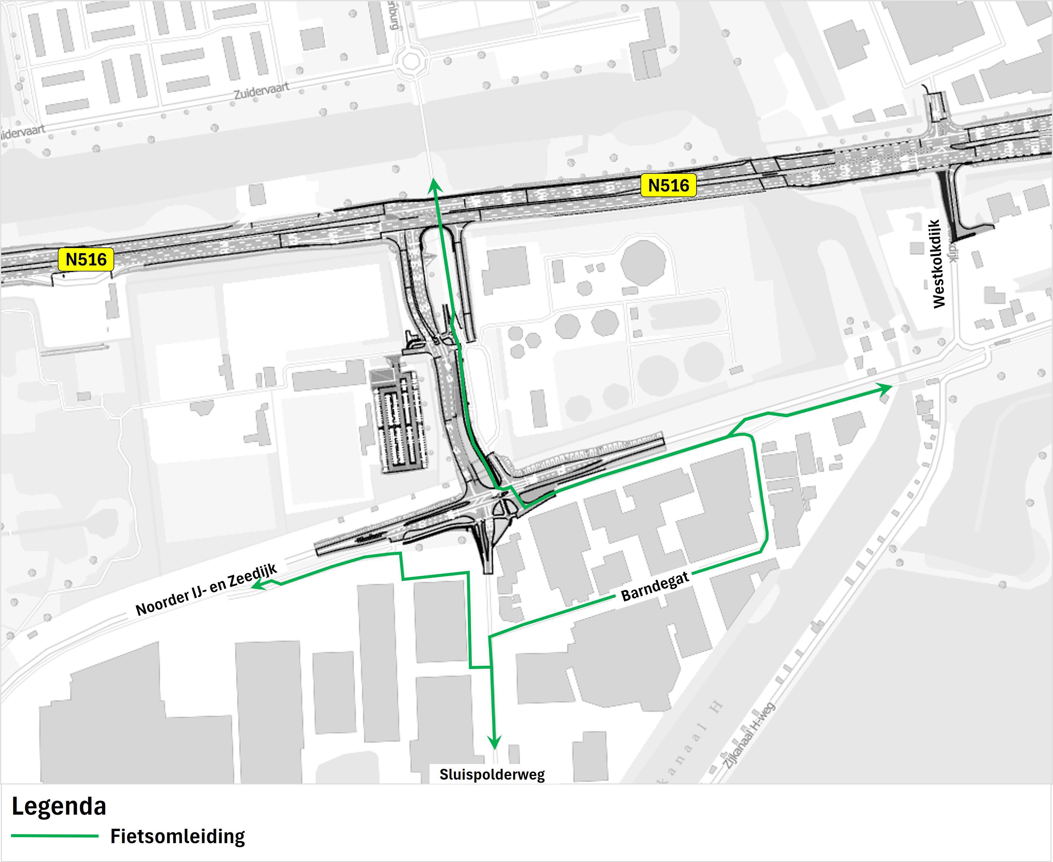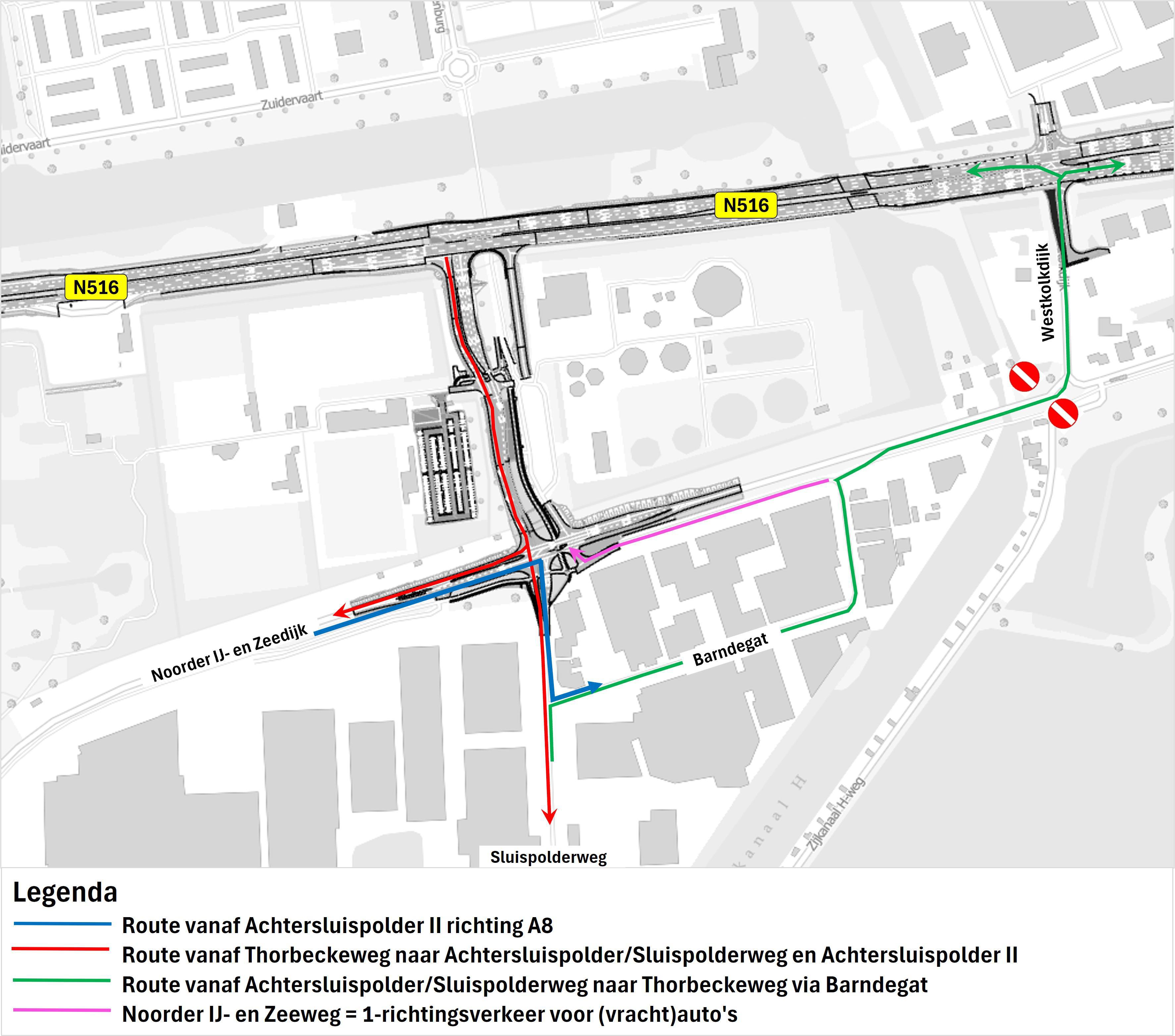Tijdens de laatste fase van de werkzaamheden voor de nieuwe inrichting van het kruispunt Noorder IJ- en Zeedijk/Sluispolderweg is er geen verkeer mogelijk vanaf de N516 via de Westkolkdijk naar de Noorder IJ- en Zeedijk.