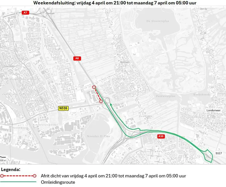 De afrit A8 (Zaandam-Zuid, Oostzaan) is van vrijdag 4 april, 21.00 tot maandag 7 april, 05.00 uur dicht.