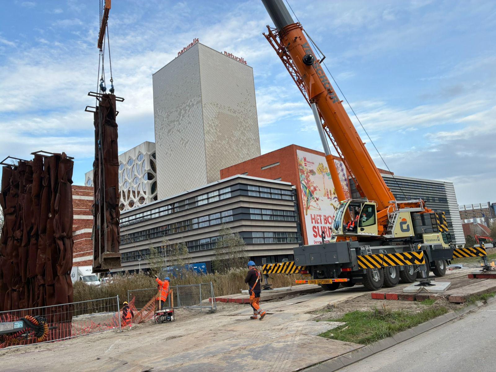 Januari van dit jaar zijn al drie beelden van de Wit verplaatst naar hun nieuwe definitieve locatie. Afgelopen maandag is nu ook beeld 1 opgepakt en verhuisd naar een nieuwe locatie, een kleine 130m verderop. Dit 17-ton zware kunstwerk is met behulp van een grote kraan op een betonnen voet gezet. Dankzij deze solide fundering kan het beeld de aankomende decennia zijn pracht behouden.