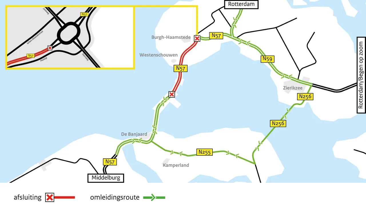Rijkswaterstaat sluit in het weekend van 16-19 april 2021 de 2 nieuwe rotondes bij Burgh-Haamstede aan op de autoweg N57. Daarom is de N57 tussen de rotonde Steursweg (Burgh-Haamstede) en Neeltje Jans (Oosterscheldekering) in beide richtingen afgesloten.