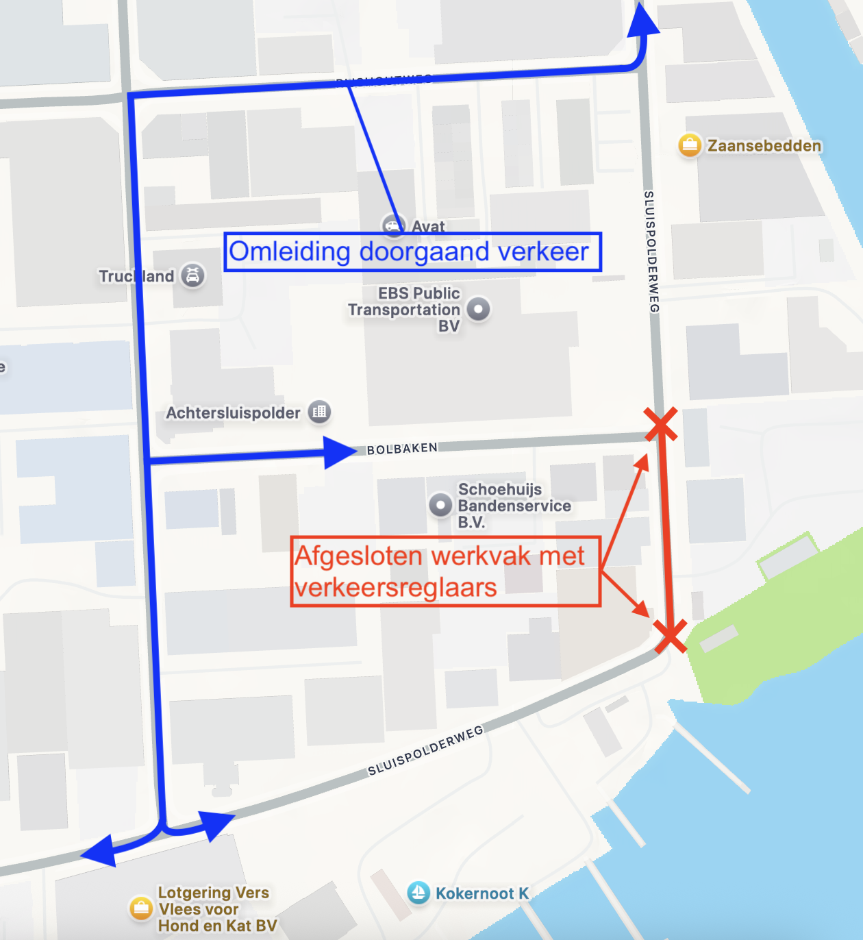 Doorgaand verkeer wordt omgeleidt via de Rijshoutweg en Kruisbaken en bestemmingsverkeer naar de direct aanliggende bedrijven in het werkvak kunnen zich melden bij de verkeersregelaars om toegang naar hun bedrijf/ locatie te krijgen.